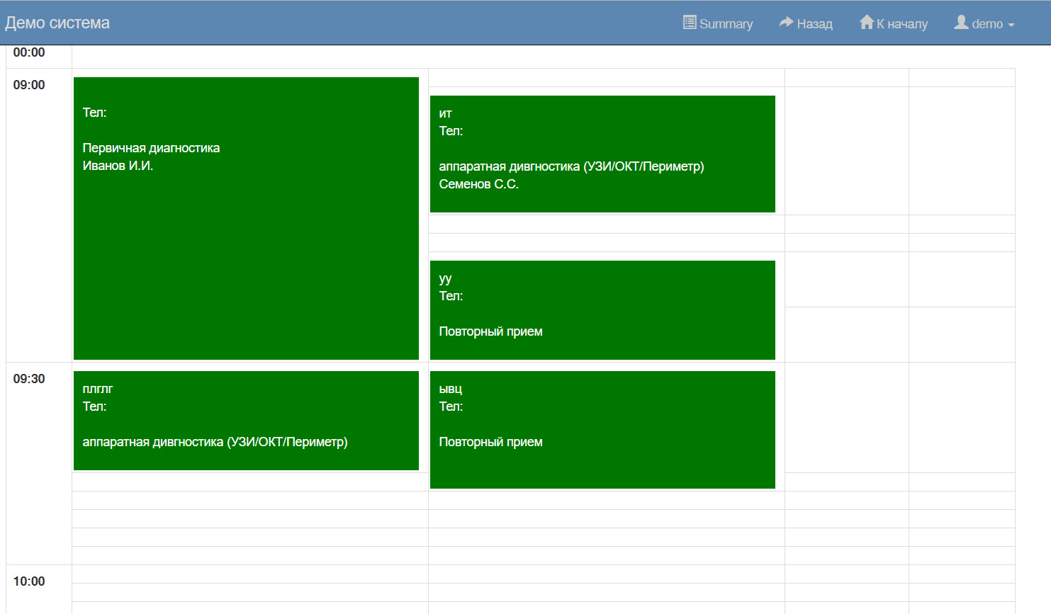 Сама запись осуществляется через сетку, где для каждого дня недели отображается клетка для записи. Белые клетки- доступные места записи, Зеленые - уже записанные пациенты(отображается также фамилия записанного), и серые - недоступные времена записи. Сама запись осуществляется щелчком по ячейке и либо вводом фамилии, имени, отчества и даты рождения, либо, если пациент, знает номер карты - по номеру карты.