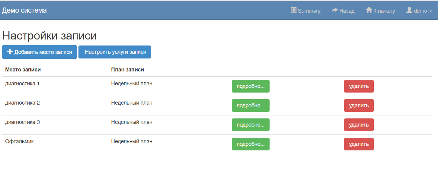 Количество мест, куда осуществляется запись ничем не ограничена, может осуществляться общая запись в регистратуру, или запись отдельно к каждому специалисту, или на отдельные процедуры и обследования. Просто нужно указать название и график работы.