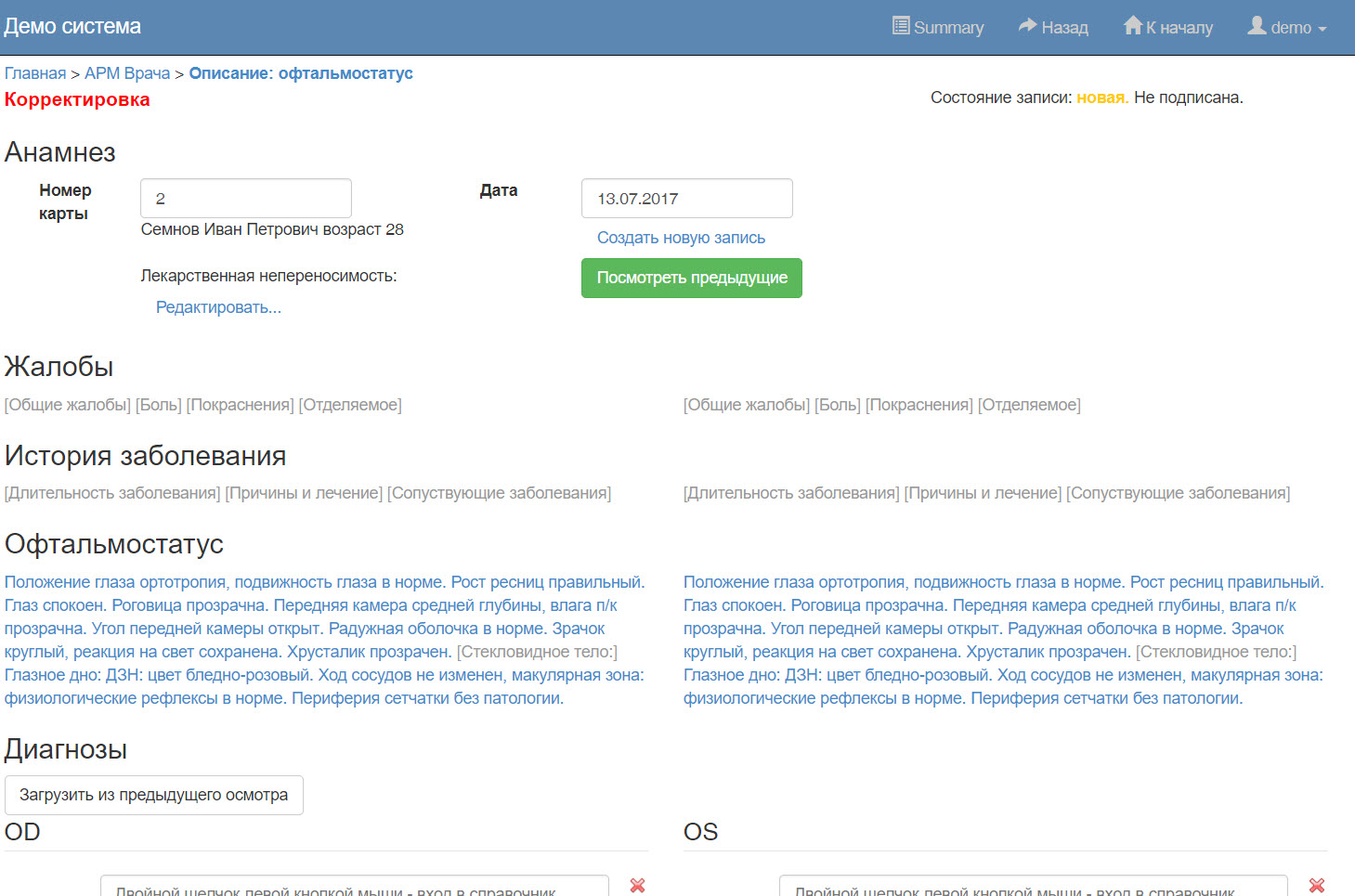 Модуль позволяет в считанные минуты, не прибегая, к использованию клавиатуры составить полное описание анамнеза и офтальмостатуса глаз. Для удобства ввода описание разбито на разделы глаза. Если какой-либо отдел глаза не имеет отклонений, то его можно пропустить и в описании появится запись, описывающая нормальное состояние. История операций и лечений, выполненных в клинике, автоматически добавляется в описание. В описание включены различные возможные отклонения нормального развития. Для каждого раздела имеются поля, где можно ввести произвольный текст. Также можно пропустить описание какого либо раздела.