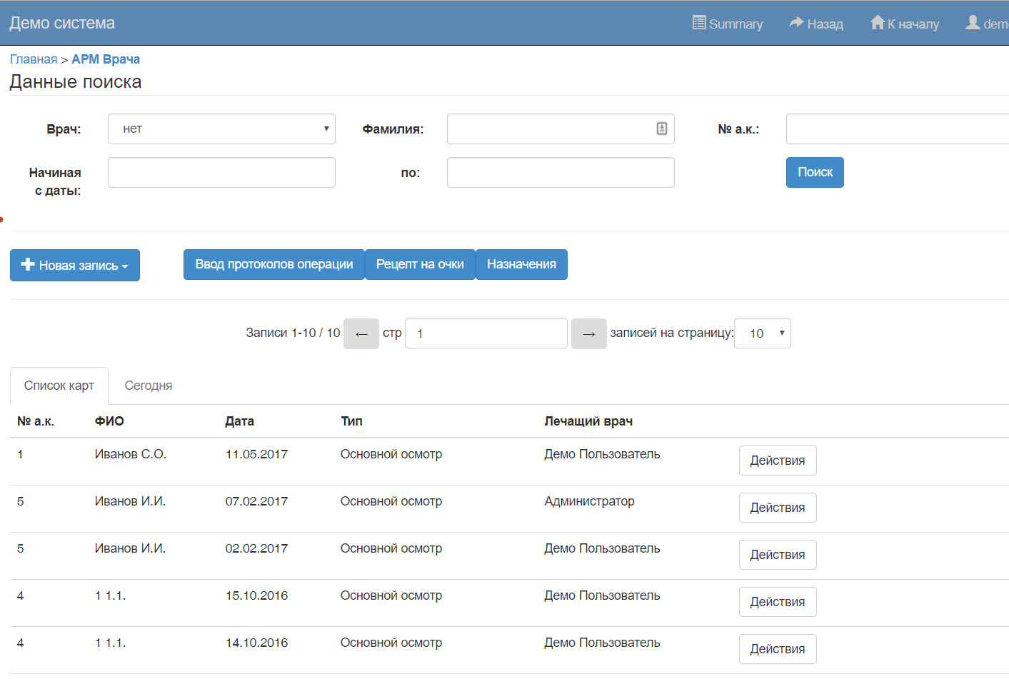 Также легко осуществить ввод диагноза, назначить лечение и дать рекомендации. Перед глазами доктора становятся доступны сделанные измерения, выполненные операции и курсы лечения и автоматизированный советчик по диагнозам. Диагнозы и лечения выбираются из справочника, утвержденного в клинике. Описания разных врачей становятся унифицированными, исключающими различную трактовку и надежно сохраняются в электронной истории пациента. В дальнейшем можно использовать предыдущие описания для быстрой корректировки произошедших изменений.