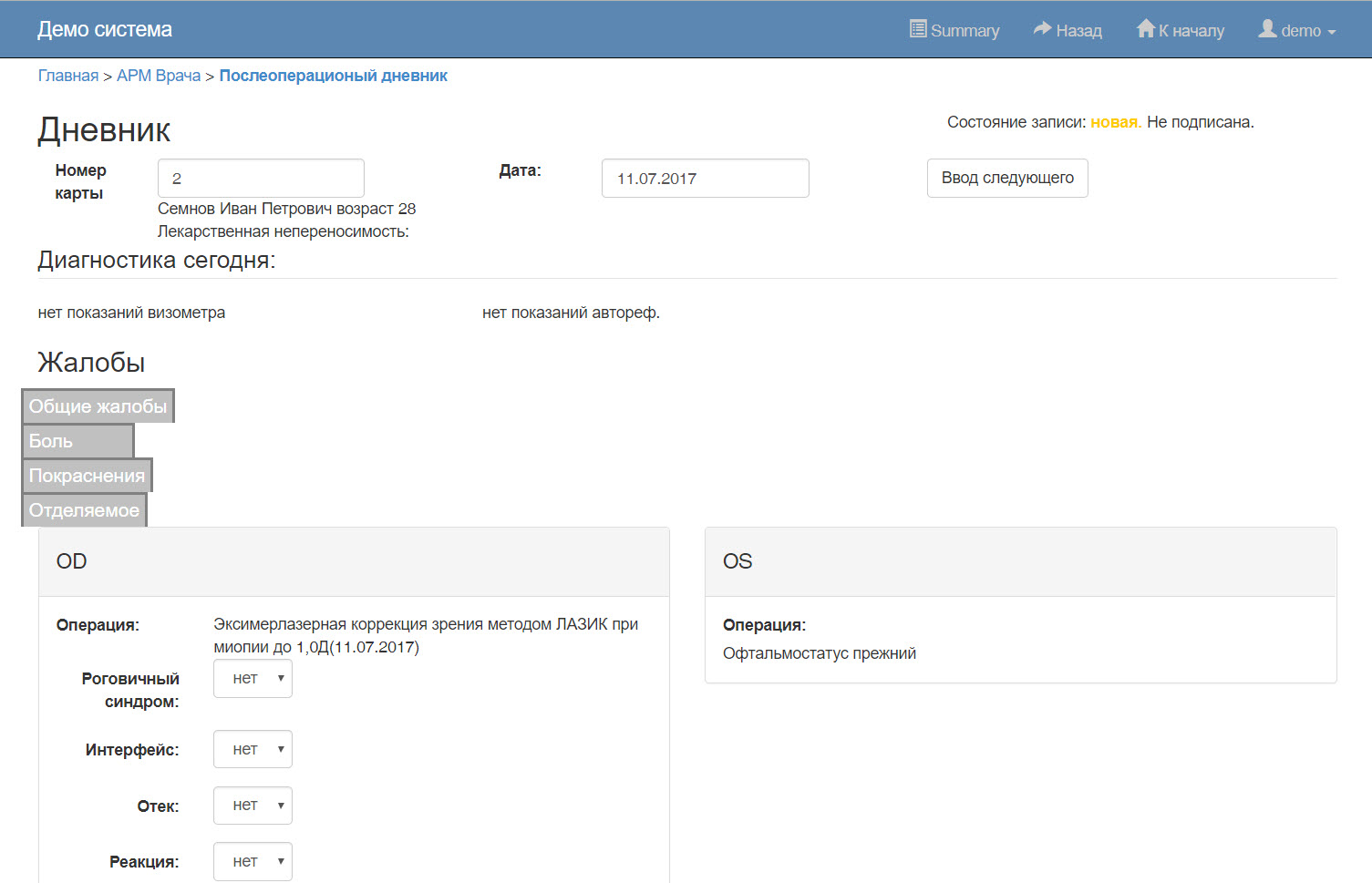 Для наблюдения пациентов после операции есть сокращенное описание в виде дневников. На разные типы операций, разработаны формы для ввода типичных изменений послеоперационного состояния глаза. Добавляются диагнозы, отражающее состояние после операции. Можно быстро загрузить диагнозы, которые были до операции, написать рекомендации, запланировать следующие этапы лечения.