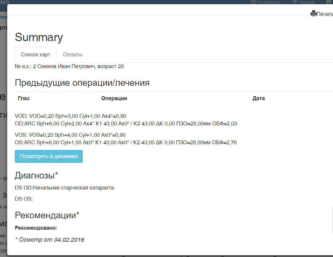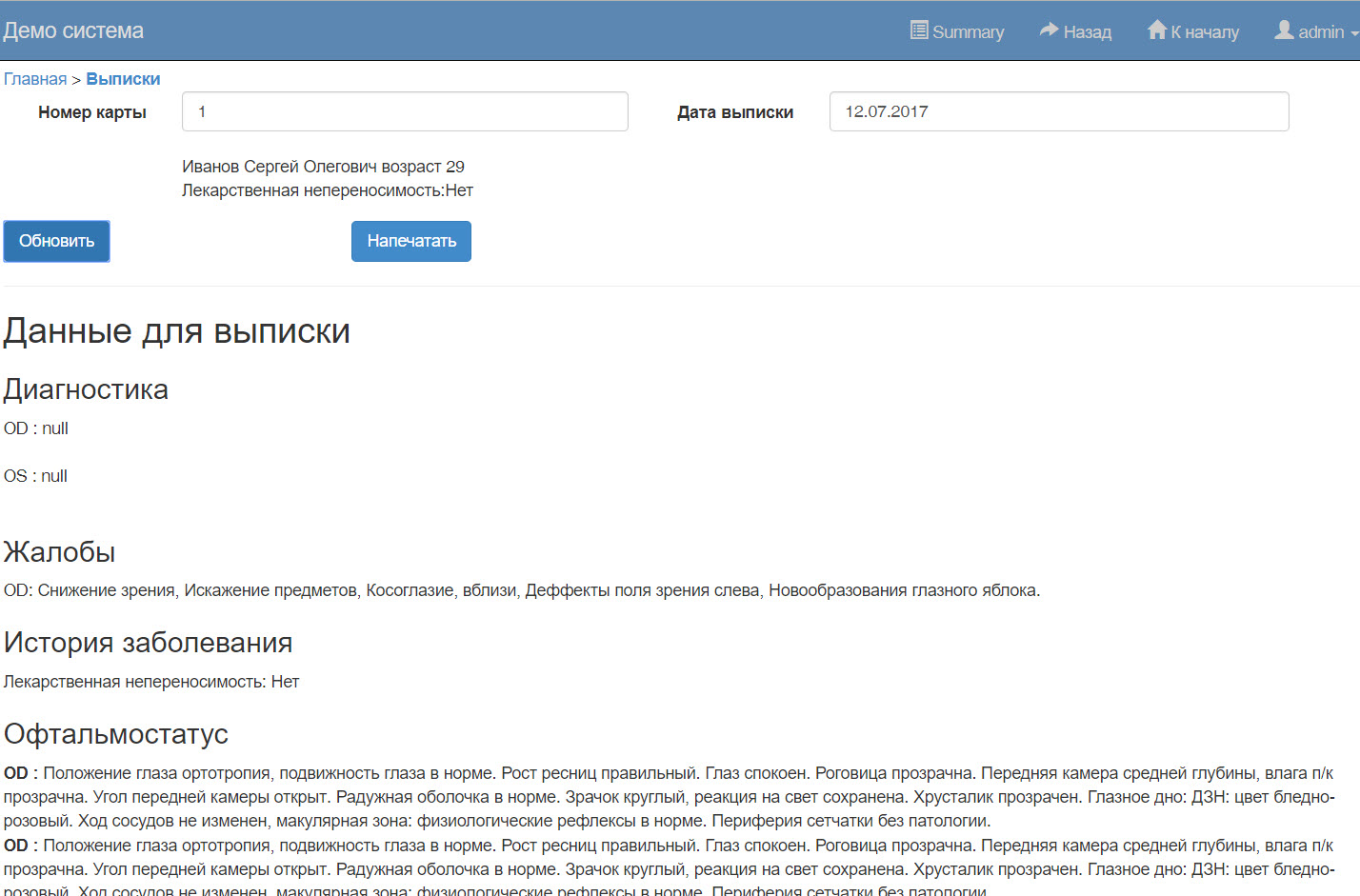 В системе присутствует хороший инструмент для формирования различных выписок, а также просмотра ранее сделанных наблюдений. По результатам обследования и лечения очень просто сформировать выписку, которую можно отдать пациенту. В ней будут указаны результаты проведенного обследования, поставленный диагноз и рекомендации врача. Если было проведено лечение, то его легко включить в выписку. Также можно сформировать рецепт на очки по результатам диагностики.