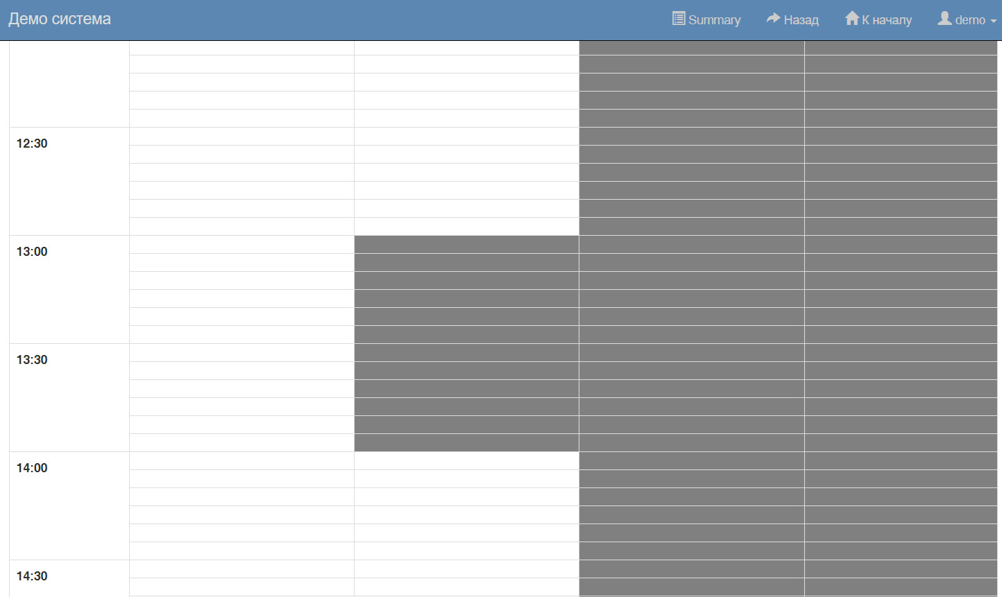 Сама запись осуществляется через сетку, где для каждого дня недели отображается клетка для записи. Белые клетки- доступные места записи, Зеленые - уже записанные пациенты(отображается также фамилия записанного), и серые - недоступные времена записи. Сама запись осуществляется щелчком по ячейке и либо вводом фамилии, имени, отчества и даты рождения, либо, если пациент, знает номер карты - по номеру карты.
