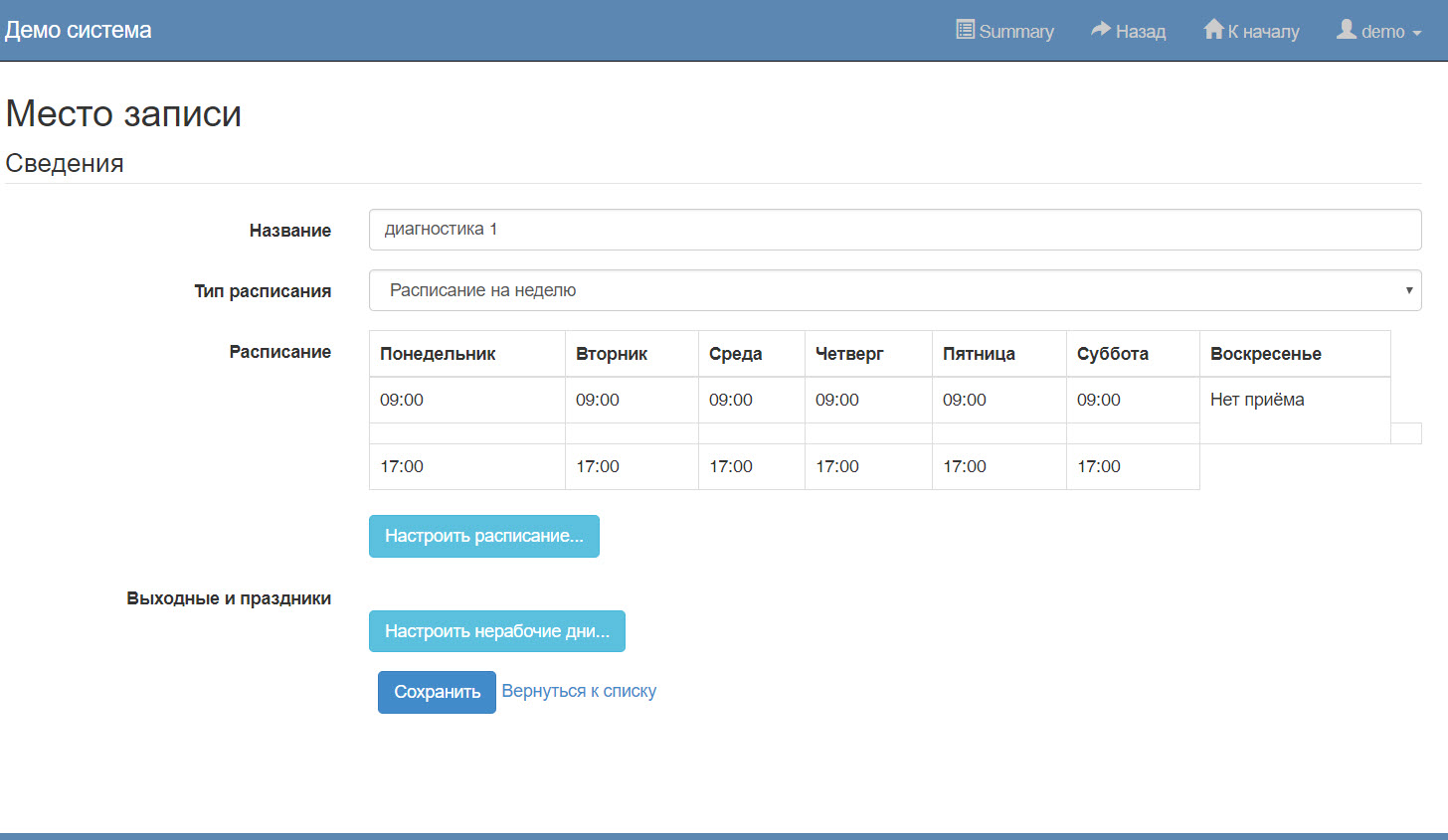 Количество мест, куда осуществляется запись ничем не ограничена, может осуществляться общая запись в регистратуру, или запись отдельно к каждому специалисту, или на отдельные процедуры и обследования. Просто нужно указать название и график работы.