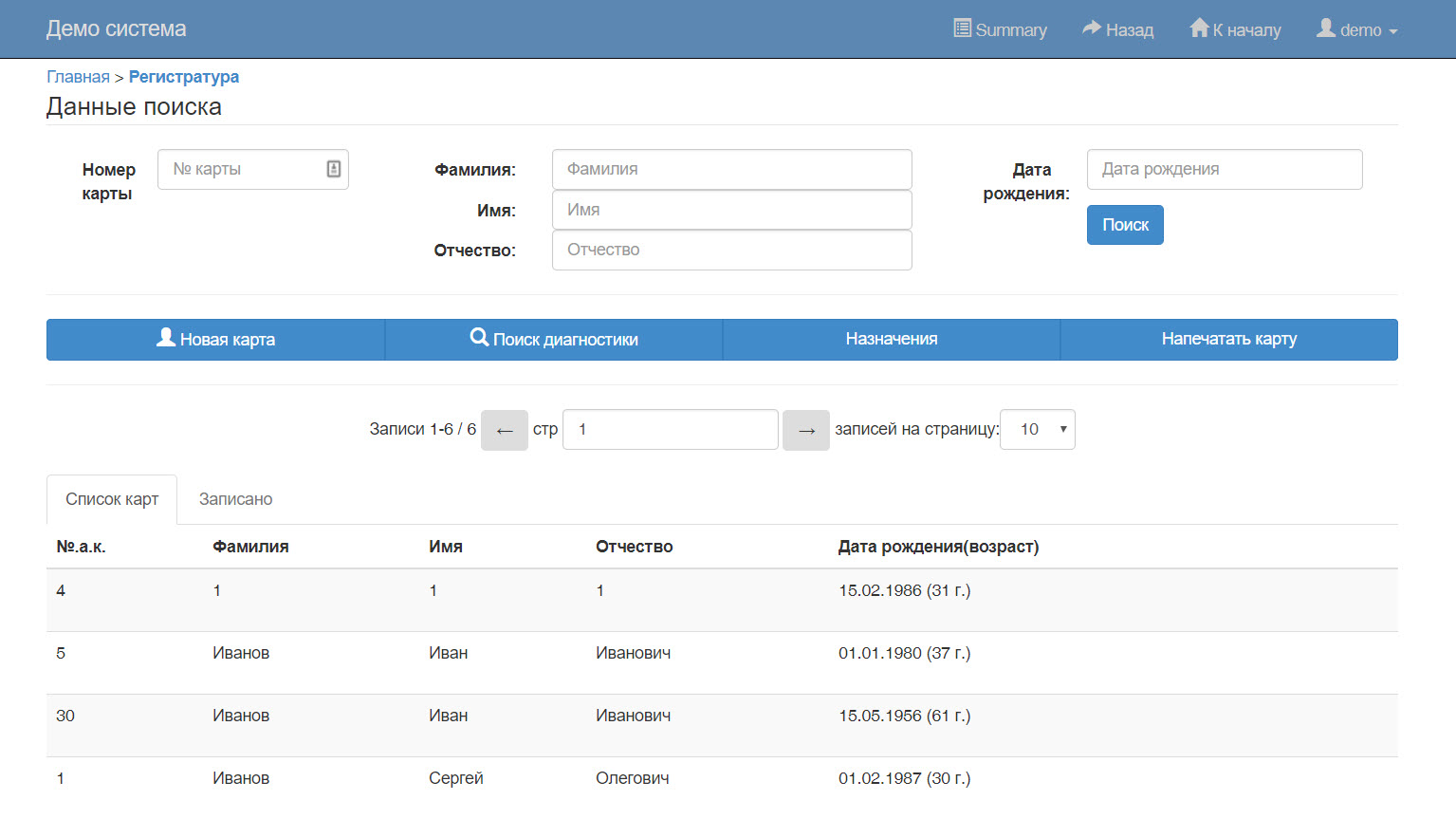Форма поиска позволяет отыскать нужную карту по различным комбинациям параметров, включая часть имени или фамилии. Результаты поиска отображаются ниже и позволяют быстро отыскать и перейти к нужному пациенту. Для наглядности, результаты отображаются по-странично